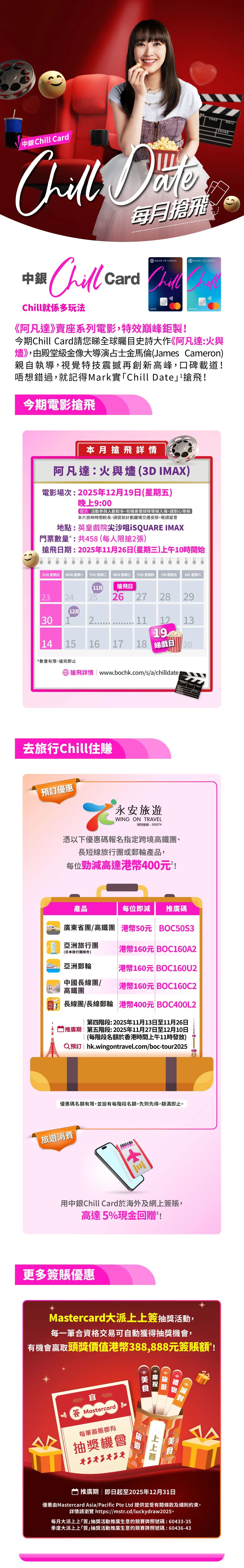 2. 優惠只適用於由香港發行並印有中銀標誌的中銀 Chill Card(包括中銀 Chill World Mastercard 及中銀 Chill Platinum Mastercard) (下稱「合資格信用卡」)。