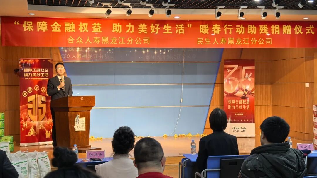 3月11日,民生保险黑龙江分公司携手合众人寿黑龙江分公司,以及哈尔滨市残疾人综合服务中心联合开展了以“保障金融权益 助力美好生活”为主题的“3·15”暖春助残捐赠活动,主动履行金融机构的社会责任,为民办实事,提升残障群体生活福祉,展现金融机构服务的温度与担当。