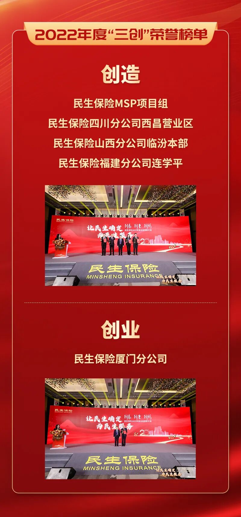 民生保险致力于服务社会民生,开业近20年来,一直践行“以用户为中心”的经营理念,始终坚持“让民生确定,为民生服务”的企业使命,不断守正创新、开拓进取,为用户提供优质的产品与服务。公司的长远发展离不开每一位优秀员工的付出,为感谢过去一年来所有为公司发展做出突出贡献的民生人,激励每一位员工创造、创业、创新,本届表彰会共颁发了5个荣誉奖项。经公司研究决定,授予民生保险MSP项目组、民生保险四川分公司西昌营业区、民生保险山西分公司临汾本部、民生保险福建分公司连学平民生保险“创造”荣誉称号;授予民生保险厦门分公司民生保险“创业”荣誉称号。受到表彰的优秀个人和单位代表依次上台领奖,全场致以热烈掌声。荣誉获得者代表MSP项目组霍靖、福建分公司连学平、厦门分公司李勇分别上台发言。荣誉背后是艰苦付出,是不畏艰难困苦的勇气和决心,是浇筑辛勤与奋斗的汗水。对于每一位民生战士而言,表彰会是一场进步的洗礼,每个民生保险人心中坚守着初心与信念,用专业和热爱服务于每一位民生用户。