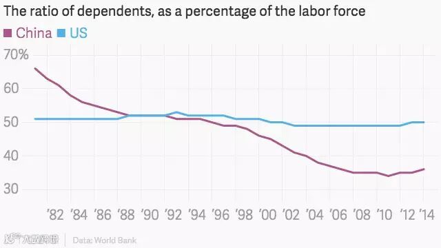 目前,中国的非工作年龄人口与工作人口的比例相对较低,而在美国这一比例较高。