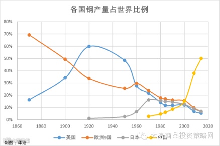 多个发达国家钢产量占全球总产出的比重曾经冲高回落。美国粗钢产量占比在1920年左右达到60%后开始下跌。日本钢铁产量占比从1950年代起快速攀升,1970年代达到16%左右的峰值后逐步回落,到2014年仅占世界总产量的不到7%。曾经在1870年占世界钢产量近40%的英国钢铁业,1980年产量仅占世界总产量的2.7%。