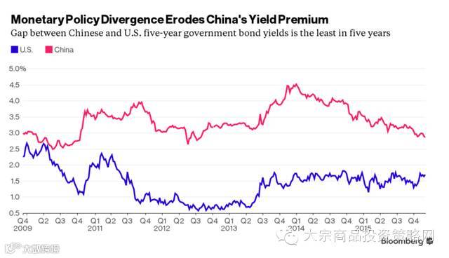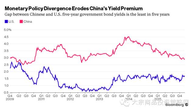 随着人民币贬值,曾经最火爆的套利交易逐渐暗淡,中国和美国五年期国债利率的利差收窄至五年最低,仅有115基点,而在2013年利差曾达到创纪录的319基点。