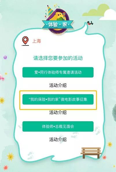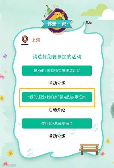 1. 以“我的保险·我的家”为话题,上传您有关保险与家的故事,展现保险对于家庭的意义,字数不低于200。符合要求,成功上传即可点亮“体验·家”徽章,同时有机会获得惊喜礼物。