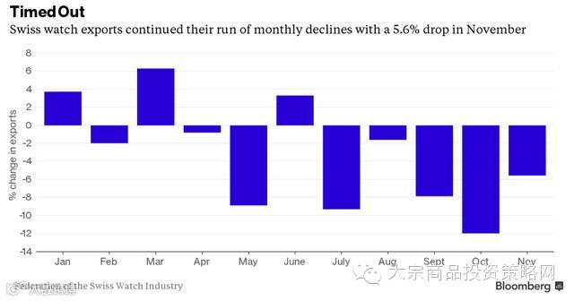 以美元计价,彭博终端数据显示,瑞士手表出口总额在11月同比大跌近11%,是2008年11月以来的最糟糕表现。