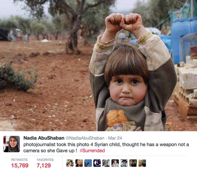 当也门发生内战,照片上的小女孩看到摄影师举起长长的镜头对准她,以为那是一把枪。于是,她举起双手,表示投降。我不敢去认真看这个孩子的眼睛,令人心酸无比。。。