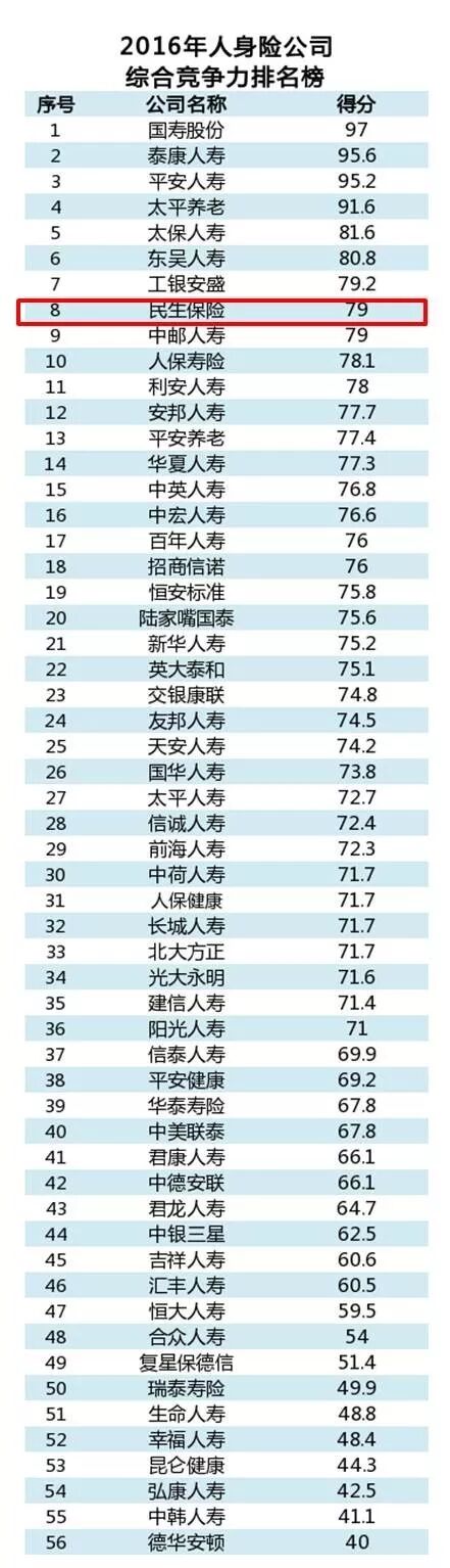 近日,2016年中国人身险公司综合竞争评价研究报告,由中央财经大学中国精算研究院权威发布。其中,民生人寿保险公司名列第八,在56家参评公司中位居前列!这是对民生人寿综合竞争力的肯定,有助于行业和消费者对民生保险的全面综合认识。