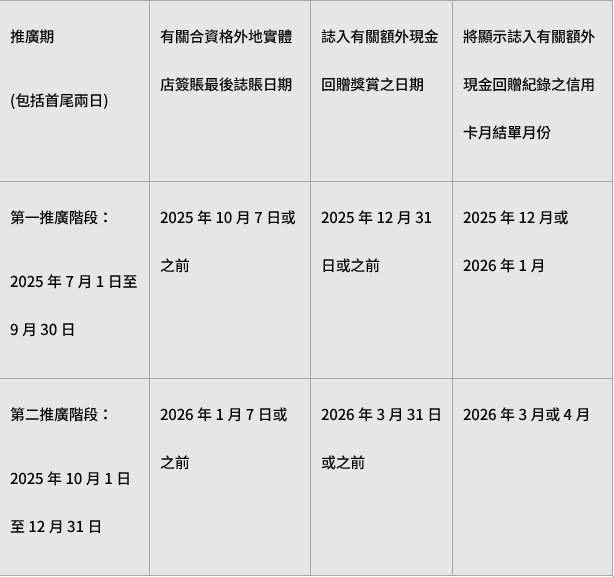 8. 所有合資格外地實體店簽賬須以交易日期計算。有關合資格外地實體店簽賬之交易紀錄經由卡公司核實無誤後,有關額外現金回贈將於推廣期內每個推廣階段最後一天起計之不多於三個月內誌入有關的合資格客戶首張成功登記的合資格信用卡賬戶內,安排詳情請見下表。有關現金回贈將以最接近的個位數字計算(以四捨五入計算),每個推廣階段之合資格外地實體店簽賬(以交易日期計算)均須於翌月7日或之前成功誌賬,方合資格獲得有關現金回贈。