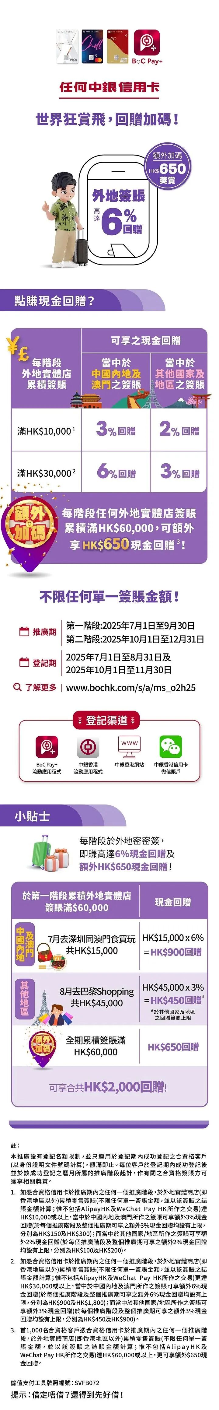 1. 中銀信用卡「狂賞飛 – 高達6%現金回贈及額外HK$650獎賞」推廣 (下稱「本推廣」) 只適用於由香港發行並印有中銀標誌的中銀信用卡、中銀雙幣卡及中銀聯營卡(下稱「合資格信用卡」),但不適用於私人客戶卡、採購卡、美金卡、及由內地及澳門發行的中銀信用卡。