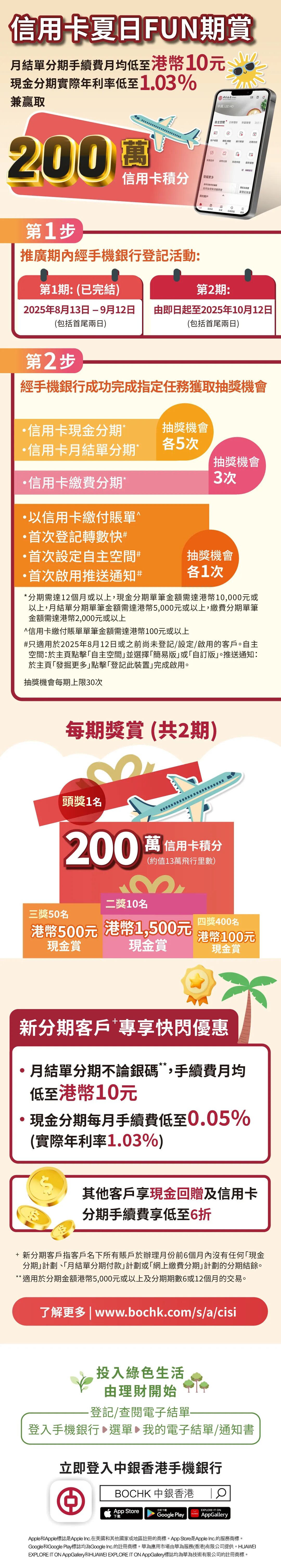 2. 新分期客戶專享快閃優惠推廣期為2025年9月13日至10月12日。只適用於新分期客戶透過手機銀行、網上銀行、中銀香港網站、BoC Pay+或「中銀香港信用卡」微信官號(「電子渠道」)辦理分期金額HK$5,000或以上及分期期數6或12個月的交易,及不可與「網上辦理享高達HK$3,300現金回贈」之優惠同時使用。「月結單分期付款」計劃:個人化一筆過手續費低至HK$60(適用於6期)及HK$120(適用於12期),以分期金額HK$40,000為例,實際年利率為0.52%(適用於6期)及0.56%(適用於12期)。「現金分期」計劃:個人化每月手續費低至0.05%,實際年利率為1.03%(適用於6期)及1.11%(適用於12期)。
