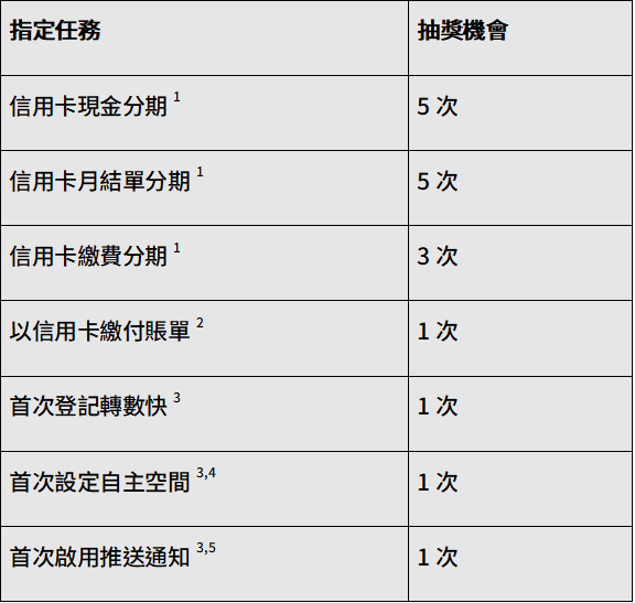 合資格客戶於推廣期內可透過經手機銀行完成以下指定任務,每期可獲抽獎機會上限30次,每期最多可中獎1次。信用卡任務只適用於由香港發行並印有中銀標誌的中銀信用卡及中銀聯營卡 (「合資格信用卡」),但不適用於私人客戶卡、採購卡、美金卡、及由內地及澳門發行的中銀信用卡。