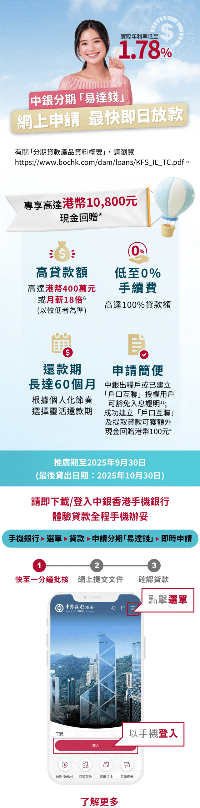 實際年利率乃根據香港銀行公會所載的有關指引計算。實際年利率是一個參考利率,以年化利率展示出包括銀行產品的基本利率及其他費用與收費。上述例子乃基於多項假設計算並只作參考用途。有關貸款及優惠之詳情、利率、手續費、條款及細則,請瀏覽中銀香港網站上載的「分期貸款產品資料概要」(主頁 > 貸款 > 私人貸款 > 中銀分期「易達錢」或中銀分期「易達錢」貸款加借或中銀分期「易達錢」結餘轉戶),或向中銀香港職員查詢。