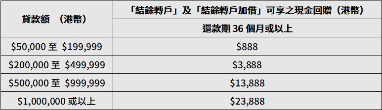 2.2 客戶於推廣期內成功申請「結餘轉戶」或「結餘轉戶加借」,並於2025年10月31日或之前成功提取貸款,而貸款額達港幣5萬或以上及還款期為36個月或以上,可按下表享有對應的現金回贈。