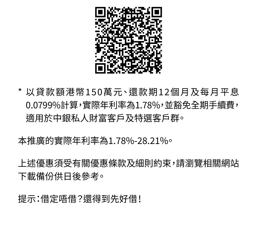 實際年利率低至1.78%優惠適用於符合指定條件之客戶(以貸款額港幣150萬元或以上、還款期12個月及每月平息0.0799%計算,並豁免全期手續費,適用中銀私人財富客戶及特選客戶群)。