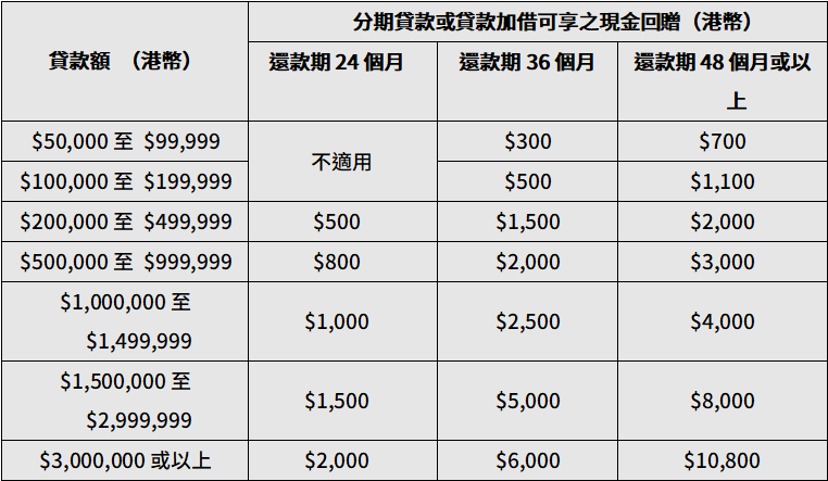 1.2 客戶於推廣期內成功申請「分期貸款」或「貸款加借」,並於2025年10月31日或之前成功提取貸款,而貸款額達港幣20萬或以上及還款期為24個月;或貸款額達港幣5萬或以上及還款期為36個月或以上,可按下表享有對應的現金回贈。