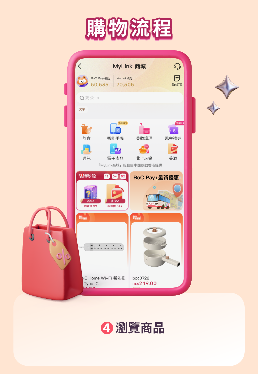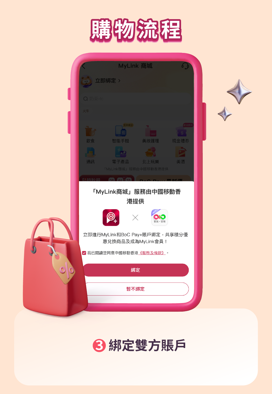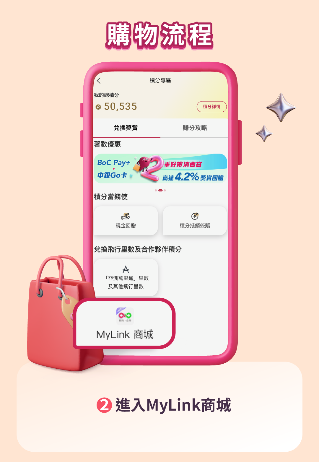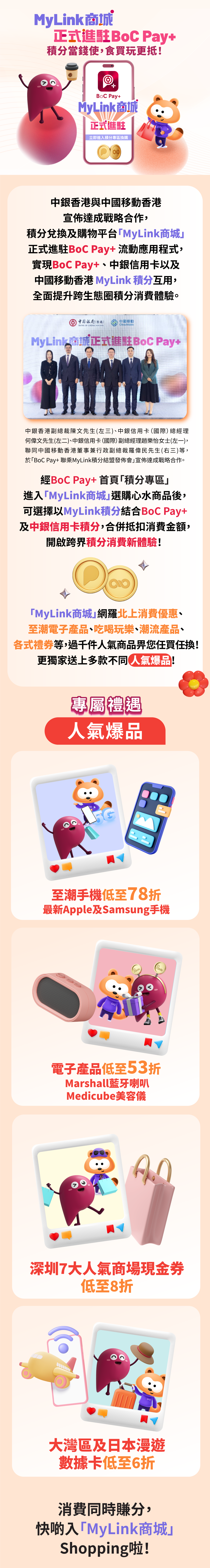 2. 如欲使用「MyLink商城」,需將BoC Pay+賬號與MyLink商城進行賬號綁定,並在完成身分驗證後成為MyLink商城會員,以便進行後續換購流程。