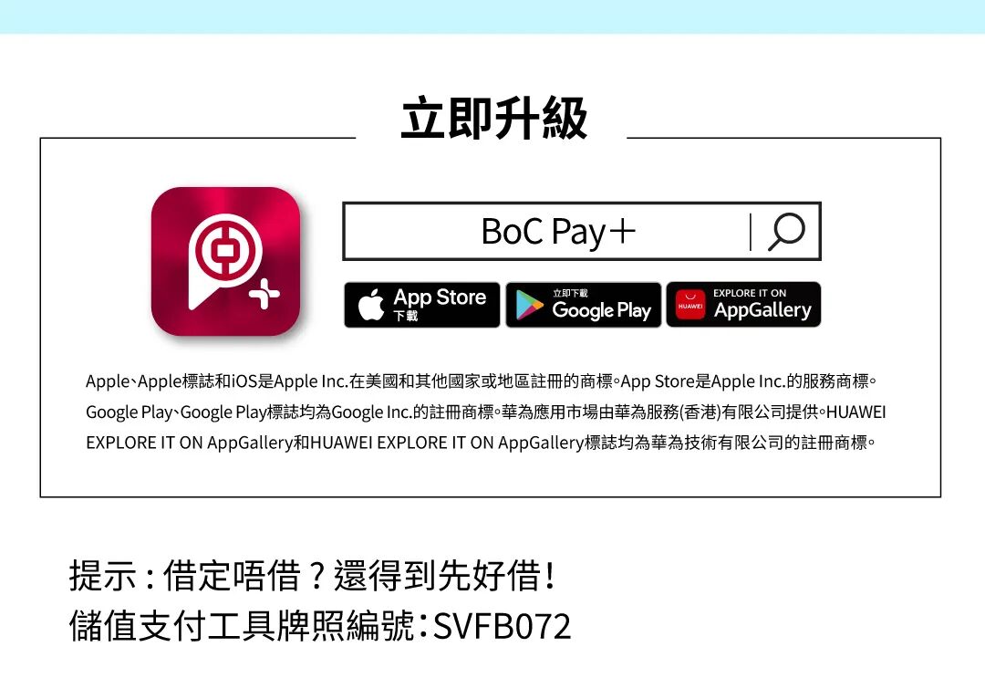 3. 請透過官方應用程式商店或中銀香港網站下載BoC Pay+ 流動應用程式,並注意搜尋的關鍵字(“BoC Pay+”)。iPhone 用戶請透過 App Store 下載BoC Pay+;Android 用戶可透過 Google Play 商店、華為應用市場或中銀香港網站下載 BoC Pay+。