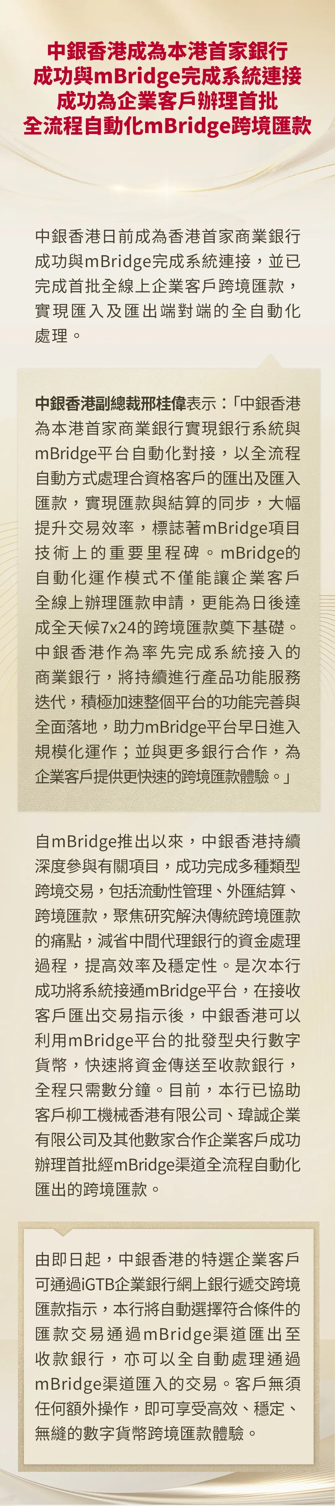 导读:中銀香港成為本港首家銀行成功與mBridge完成系統連接成功為企業客戶辦理首批全流程自動化mBridge跨境匯款