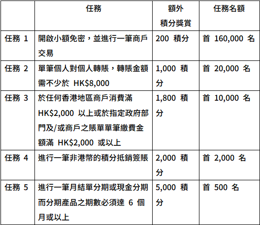 4. 每位合資格客戶只可參與任務1至任務5各一次。每項任務額外積分獎賞只可獲取一次。
