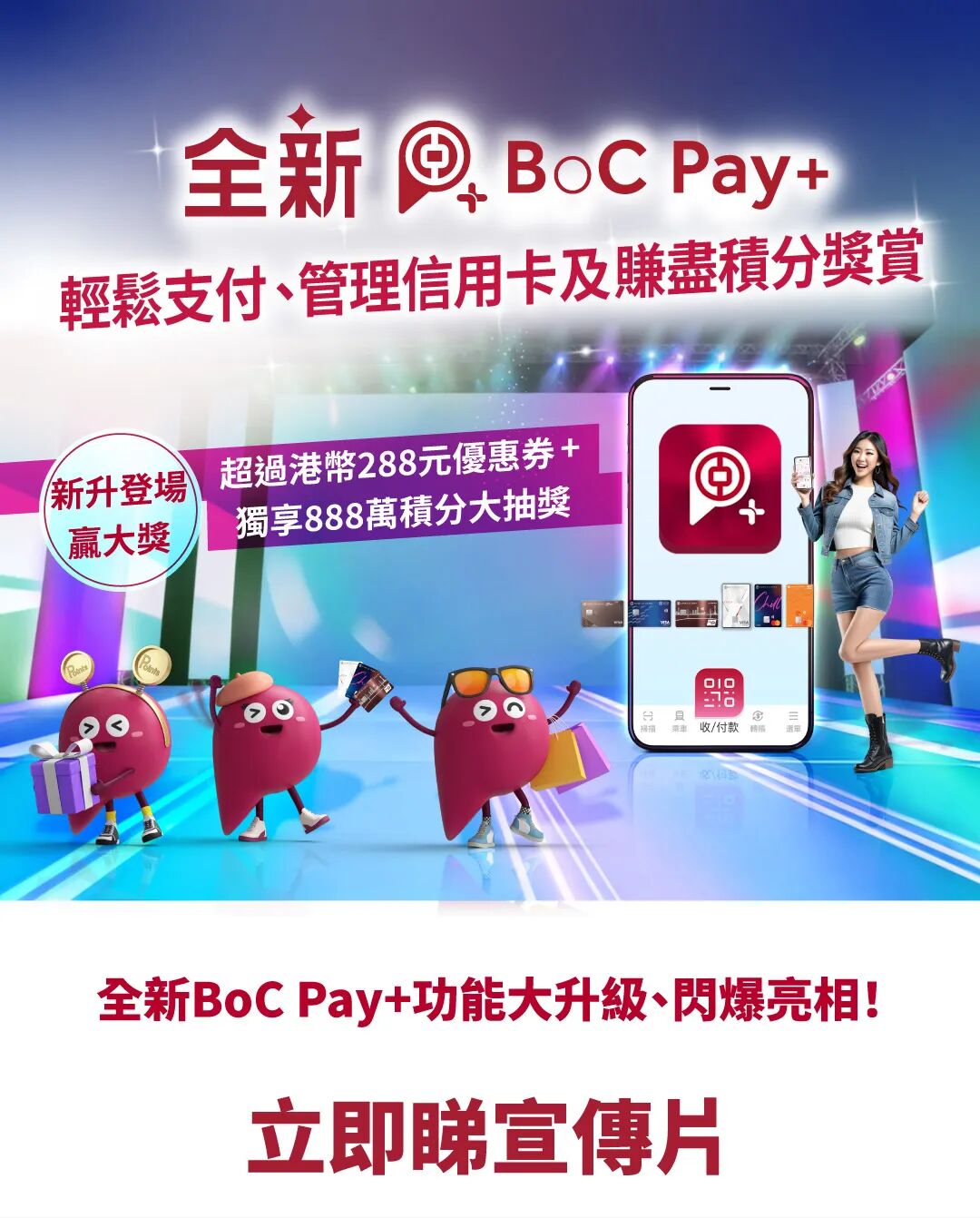 4. 有關新升登場贏大獎之詳細條款及細則,請瀏覽BoC Pay+ 流動應用程式或中銀香港網頁首頁 > 信用卡 > BoC Pay+ 內之宣傳橫額