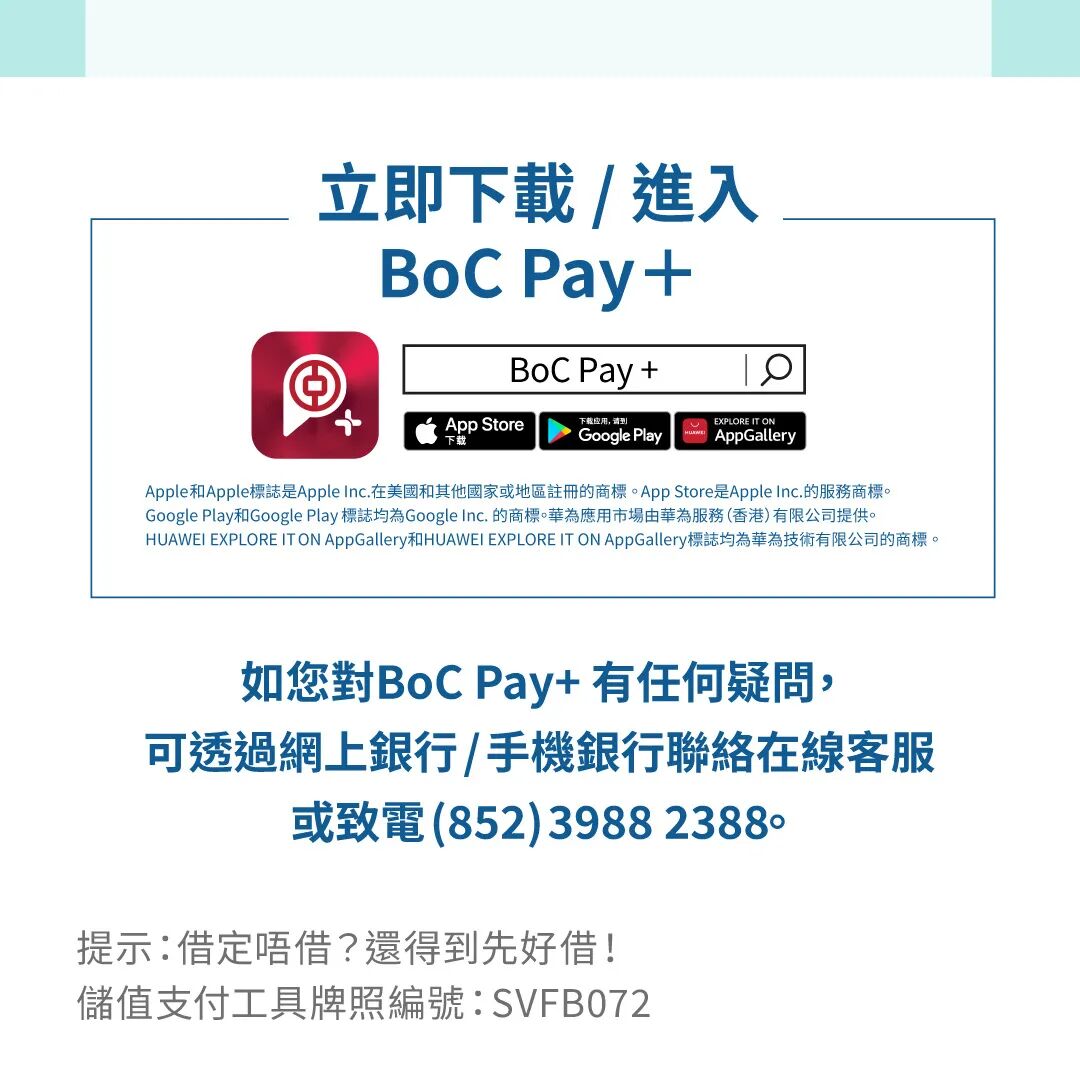 13. 請透過官方應用程式商店或中銀香港網站下載BoC Pay流動應用程式,並注意搜尋的關鍵字(“BoC Pay+”)。iPhone用戶請透過App Store下載BoC Pay+;Android用戶可透過Google Play商店、華為應用市場或中銀香港網站下載BoC Pay+。
