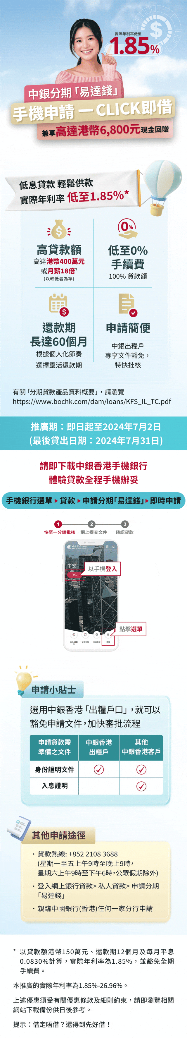 實際年利率乃根據香港銀行公會所載的有關指引計算。實際年利率是一個參考利率,以年化利率展示出包括銀行產品的基本利率及其他費用與收費。上述例子乃基於多項假設計算並只作參考用途。有關貸款及優惠之詳情、利率、手續費、實際年利率、條款及細則,請瀏覽中銀香港網站上載的「分期貸款產品資料概要」(主頁 > 貸款 > 私人貸款 > 中銀分期「易達錢」或中銀分期「易達錢」貸款加借或中銀分期「易達錢」結餘轉戶),或向中銀香港職員查詢。