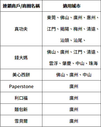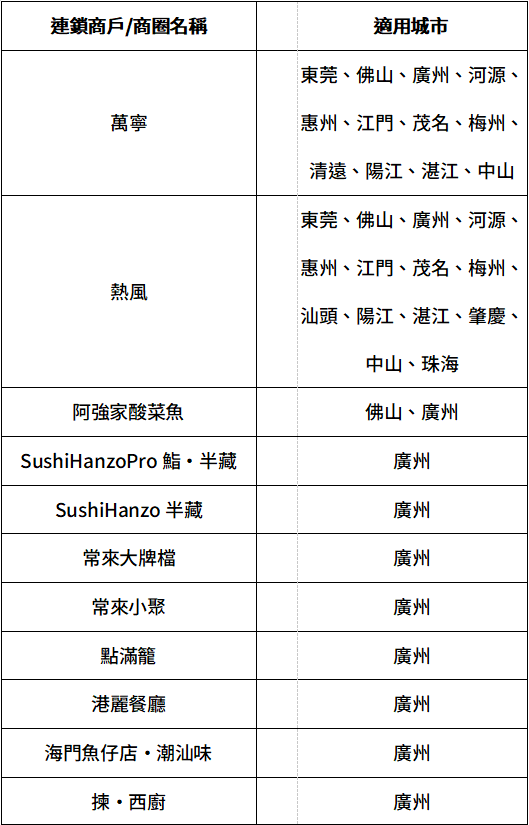2. 客戶以BoC Pay於指定廣東商戶消費滿RMB200即減RMB50(下稱「優惠」)。 本推廣只適用於下列指定廣東分店商戶:
