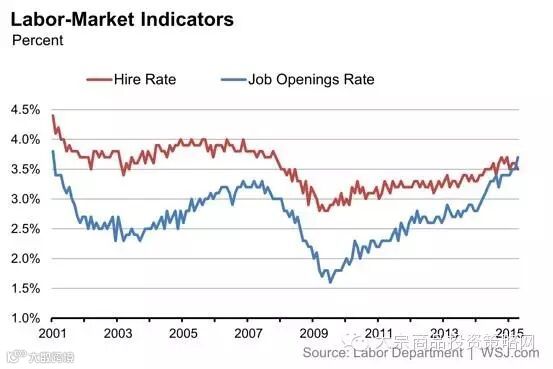 劳工部将5月新增就业人数由28万下修至25.4万。周二,劳工部将发布就业报告,提供5月劳动力市场“职位空缺及劳动力流动性调查(Job Opennings Labor Turnover Survey, JOLTS)”的信息。值得注意的一个趋势是,职位空缺率目前与雇佣率趋向一致,自劳工部2000年跟踪该数据以来,这种情况从未有过。公司雇佣的速度通常快于公开职位空缺的速度,但这两个比率之间的差异减小表明,雇主变得越来越挑剔。