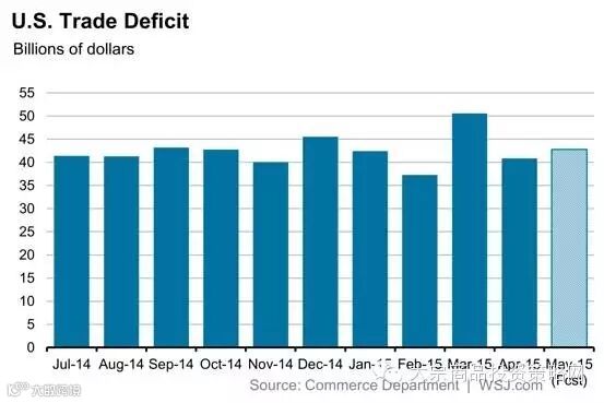 西海岸港口此前受罢工干扰,导致美国贸易赤字在2014年底和2015年前几个月规模加剧。3月,美国贸易赤字激增36%,之后在4月大幅收缩19%。西海岸港口已恢复正常运作,经济学家预计,周二将公布的5月贸易赤字数据变化不大。由华尔街日报调查的经济学家们就5月贸易赤字的预期中值为428亿美元。美国4月贸易赤字为409亿美元。