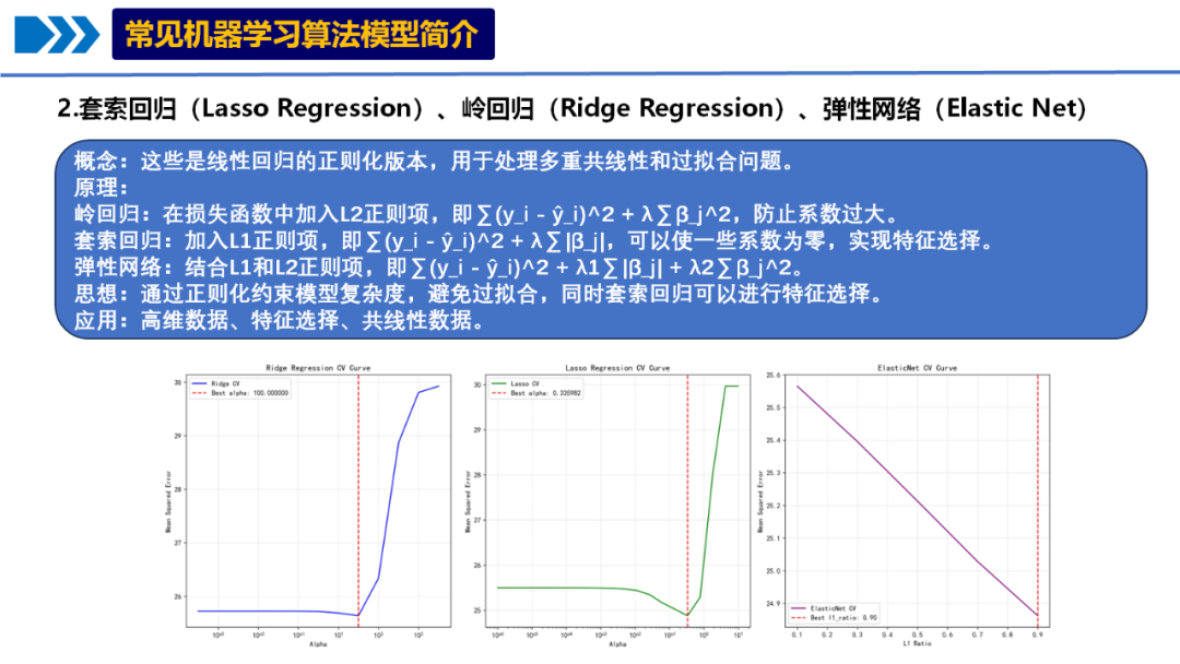概念:这些是线性回归的正则化版本,用于处理多重共线性和过拟合问题。
