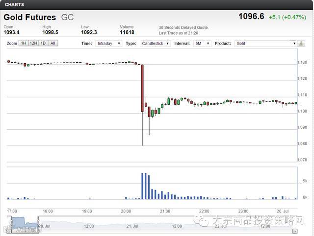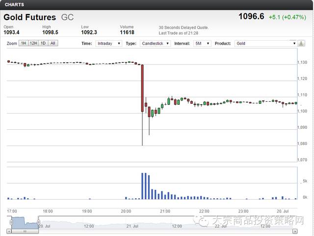 周一,芝商所的旗下COMEX黄金(代码:GC)在亚市早盘出现闪崩,2分钟内跌去60美元,击穿了1100美元的重要心理关口,创5年新低。如此大的跌幅让市场震惊。
