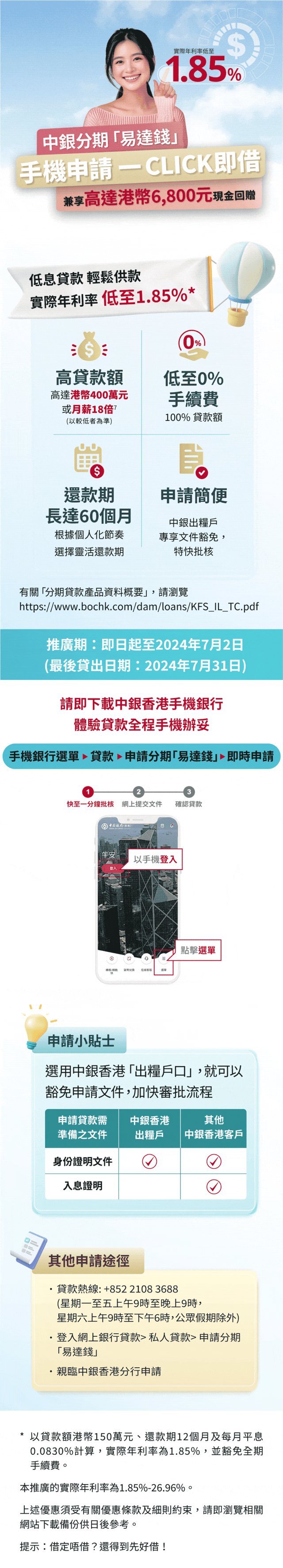 實際年利率乃根據香港銀行公會所載的有關指引計算。實際年利率是一個參考利率,以年化利率展示出包括銀行產品的基本利率及其他費用與收費。上述例子乃基於多項假設計算並只作參考用途。有關貸款及優惠之詳情、利率、手續費、實際年利率、條款及細則,請瀏覽中銀香港網站上載的「分期貸款產品資料概要」(主頁 > 貸款 > 私人貸款 > 中銀分期「易達錢」或中銀分期「易達錢」貸款加借或中銀分期「易達錢」結餘轉戶),或向中銀香港職員查詢。