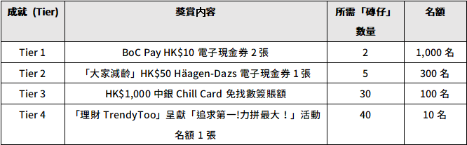 · 用戶透過遊玩本遊戲而獲得「磚仔」,當「磚仔」數量達到指定條件將自動解鎖成就並獲得對應成就内的獎賞,各個獎賞均有固定名額,並根據用戶達到對應成就的時間,以先到先得的方式誌入合資格客戶的相應賬戶,包括但不限於「大家減齡」獎賞程式賬戶、BOC Pay賬戶及/或中銀信用卡。「理財TrendyToo」呈獻「追求第一!力拼最大!」活動名額1個之得獎者將獲另行通知。
