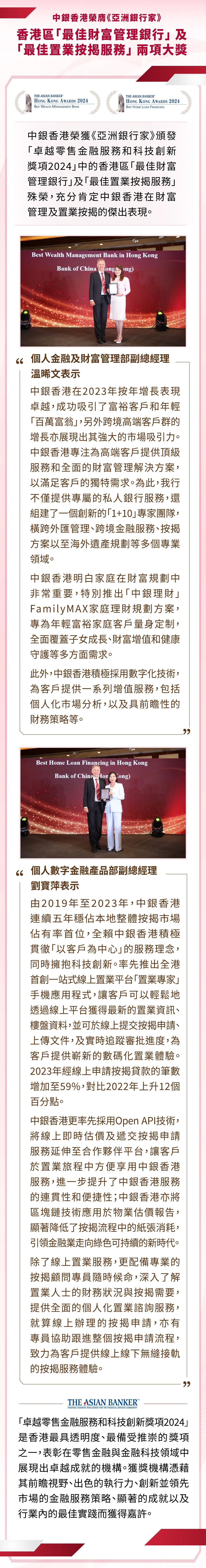 导读:中銀香港榮膺《亞洲銀行家》香港區「最佳財富管理銀行」及「最佳置業按揭服務」兩項大獎