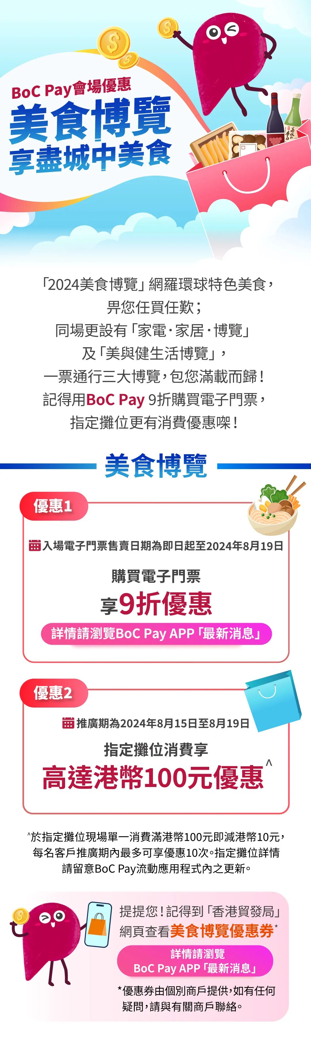 1.「BoC Pay X 美食博覽立減優惠」推廣活動(下稱「本推廣」)之推廣期為2024年8月1日至8月19日,包括首尾2日(下稱「推廣期」)。