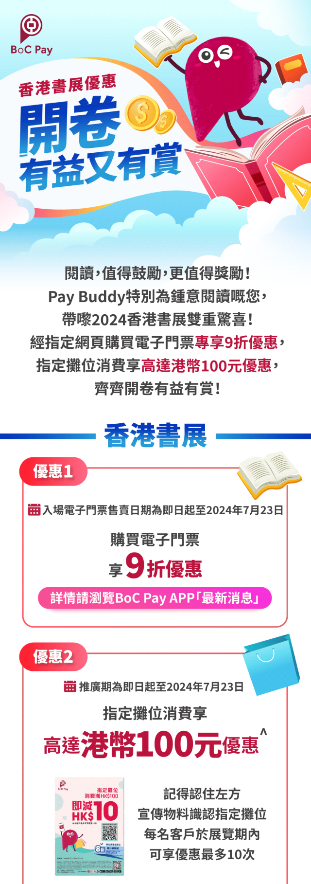 優惠二: 於2024年7月17日至7月23日,客戶於香港書展指定攤位(下稱「商戶」) ,透過BoC Pay於現場單一消費滿HK$100即減HK$10(下稱「優惠二」)。