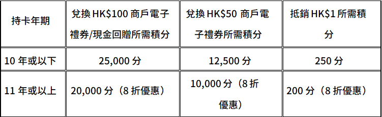 金回贈或抵銷簽賬; 客戶持卡年期滿 11 年,可以 8 折兌換率兌換商戶電子禮券/現金回贈或抵銷簽賬。