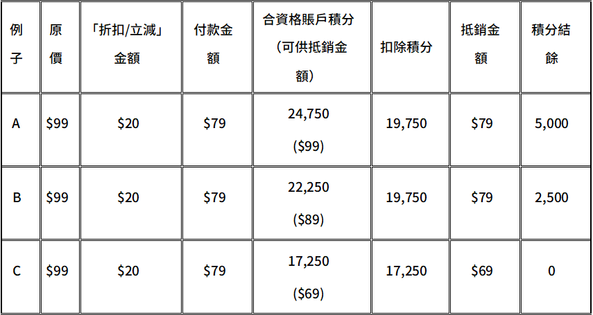 30. 客戶可於實體店/網上商店之參與商戶以合資格賬戶積分兌換即時現金折扣/指定禮券/商戶禮券,每 250 積分可兌換 HK$1 即時現金折扣;或於實體店之指定參與商戶以每 25,000 積分兌換 HK$100 指定禮券/商戶禮券。如兌換即時現金折扣,可兌換的現金折扣金額以交易金額/可用之合資格賬戶積分為上限。