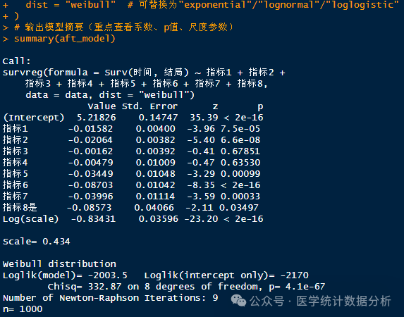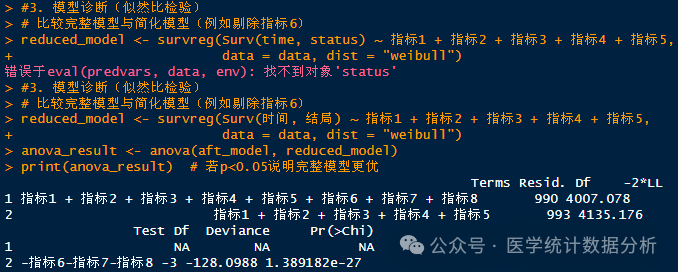 reduced_model <- survreg(Surv(时间, 结局) ~ 指标1 + 指标2 + 指标3 + 指标4 + 指标5,