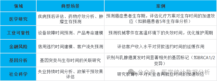 AFT模型在医学研究、工业可靠性、金融风险、基因分析、社会科学等领域均有应用: