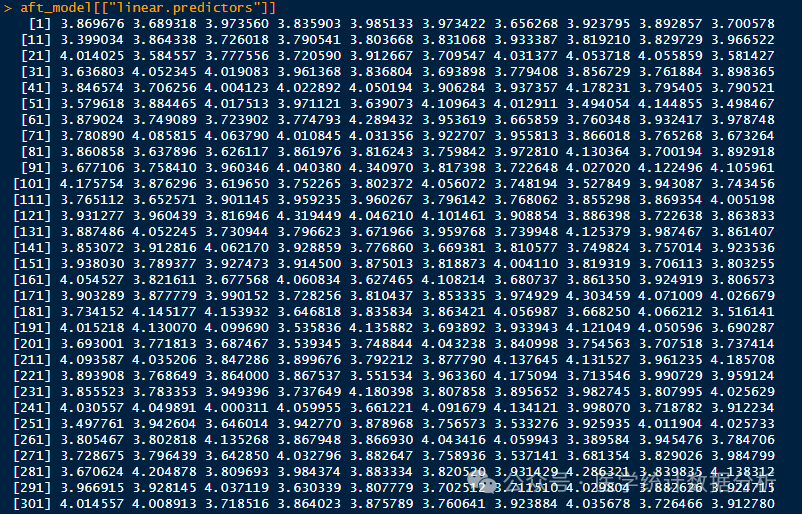 median_time <- predict(aft_model, type = "quantile", p = 0.5)