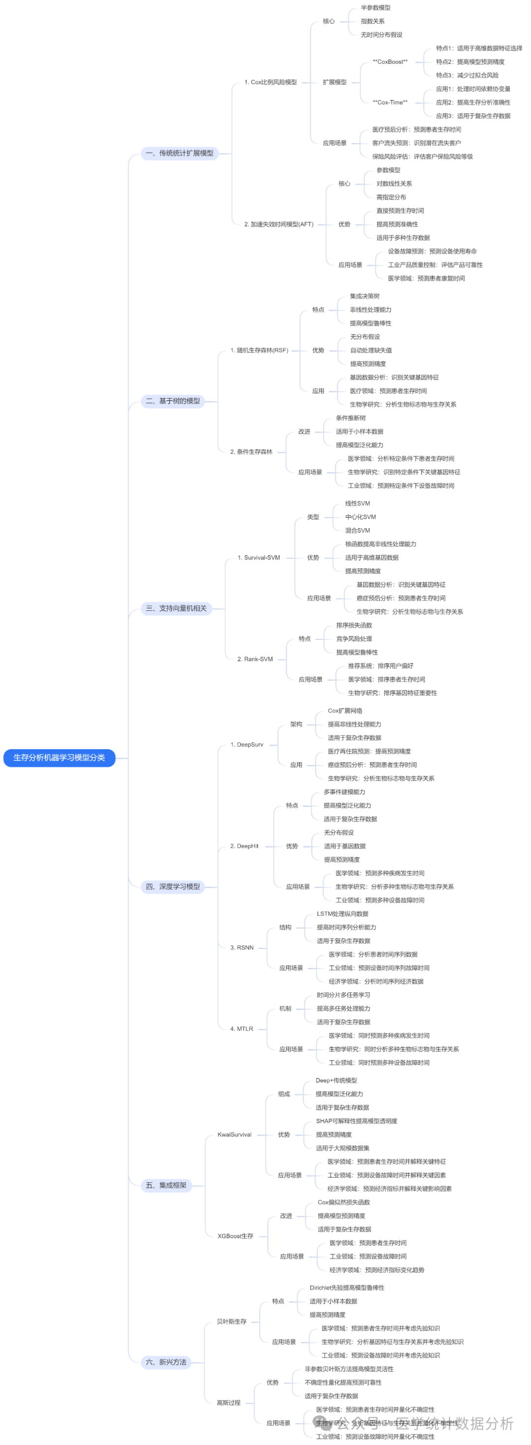 AFT模型因其直观的时间效应解释和灵活的分布假设,成为生存分析中与Cox模型互补的重要工具。其优势在需要直接量化协变量对生存时间影响的场景尤为突出,例如临床决策、工业可靠性优化及金融风险控制。随着计算技术的发展,AFT模型在高维数据、实时流数据及多模态数据中的应用将进一步拓展其边界。