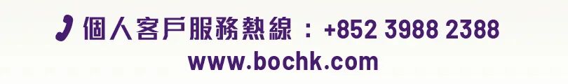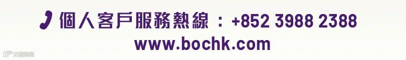 上述產品、服務與優惠受有關條款約束,詳情請參閱相關宣傳品或向中國銀行(香港) 有限公司(「中銀香港」)分行職員查詢。