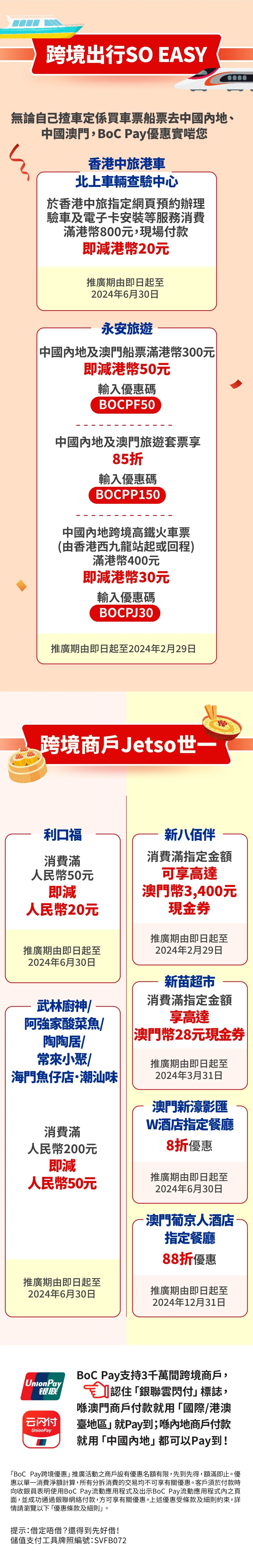 2. i) 優惠一: 客戶以 BoC Pay 於永安旅遊網上平台購買中國內地及澳門船票並輸入優惠碼 “BOCPF50”,可享滿 HK$300 即減 HK$50(下稱「優惠」)。