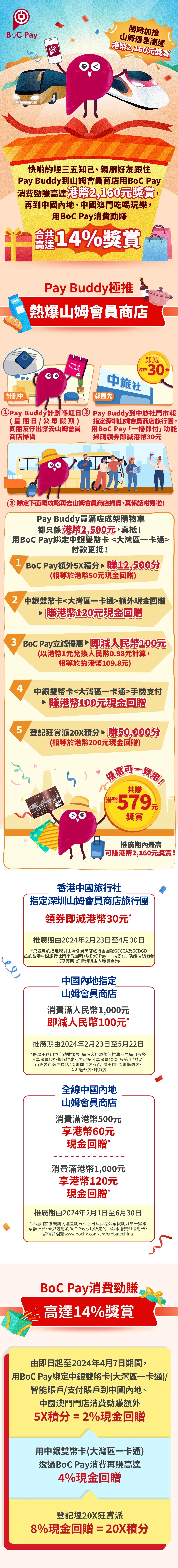 2.客戶以 BoC Pay「一掃即付」功能於香港中國旅行社門店掃瞄指定有關優惠二維碼,並成功領取立減 HK$30 優惠券後,於香港中國旅行社香港門店以 BoC Pay 報名付費參加指定深圳山姆旅行團(團號:GCCGA/GCDGD), 即可享 HK$30 立減優惠。