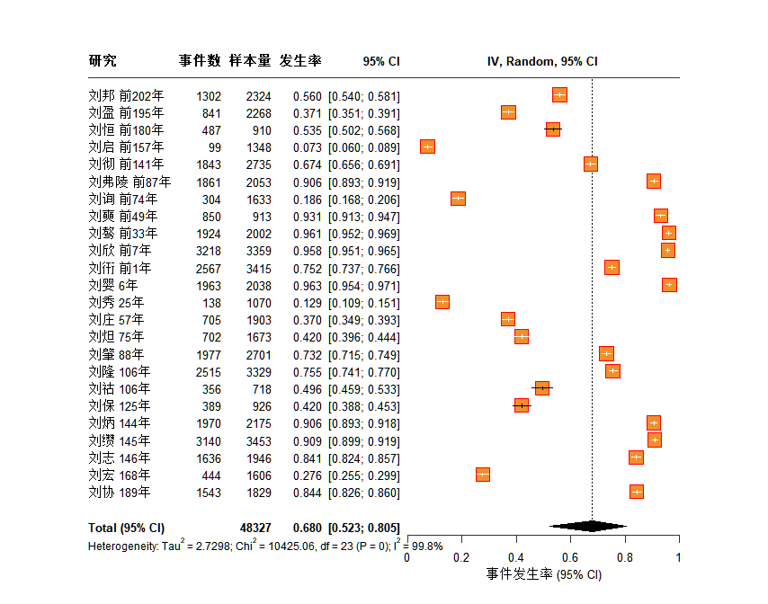 leftlabs = c("研究", "事件数", "样本量", "发生率", "95% CI"),
