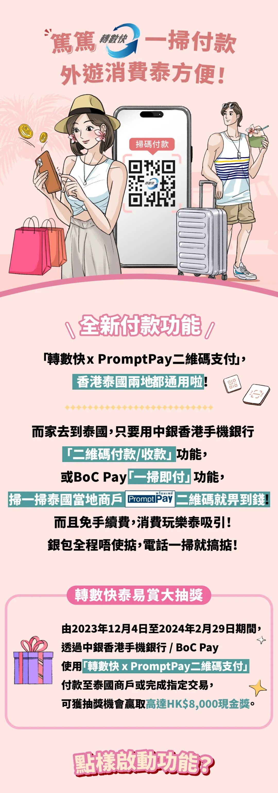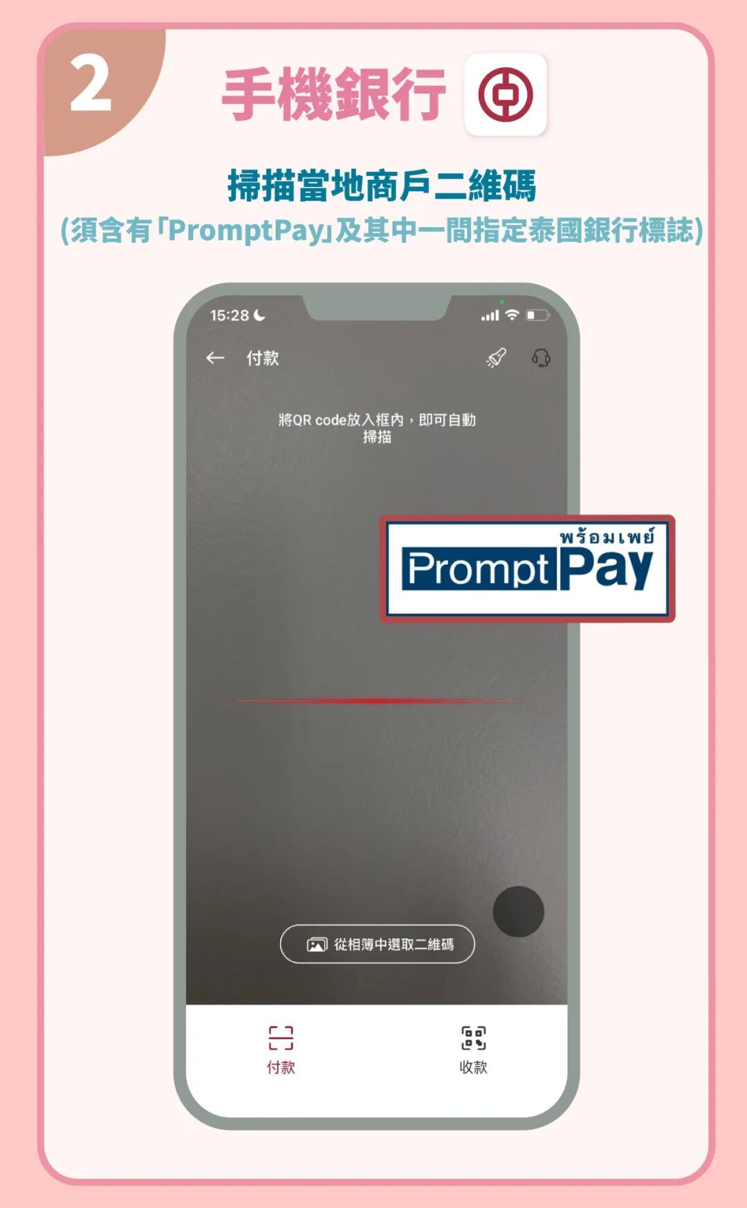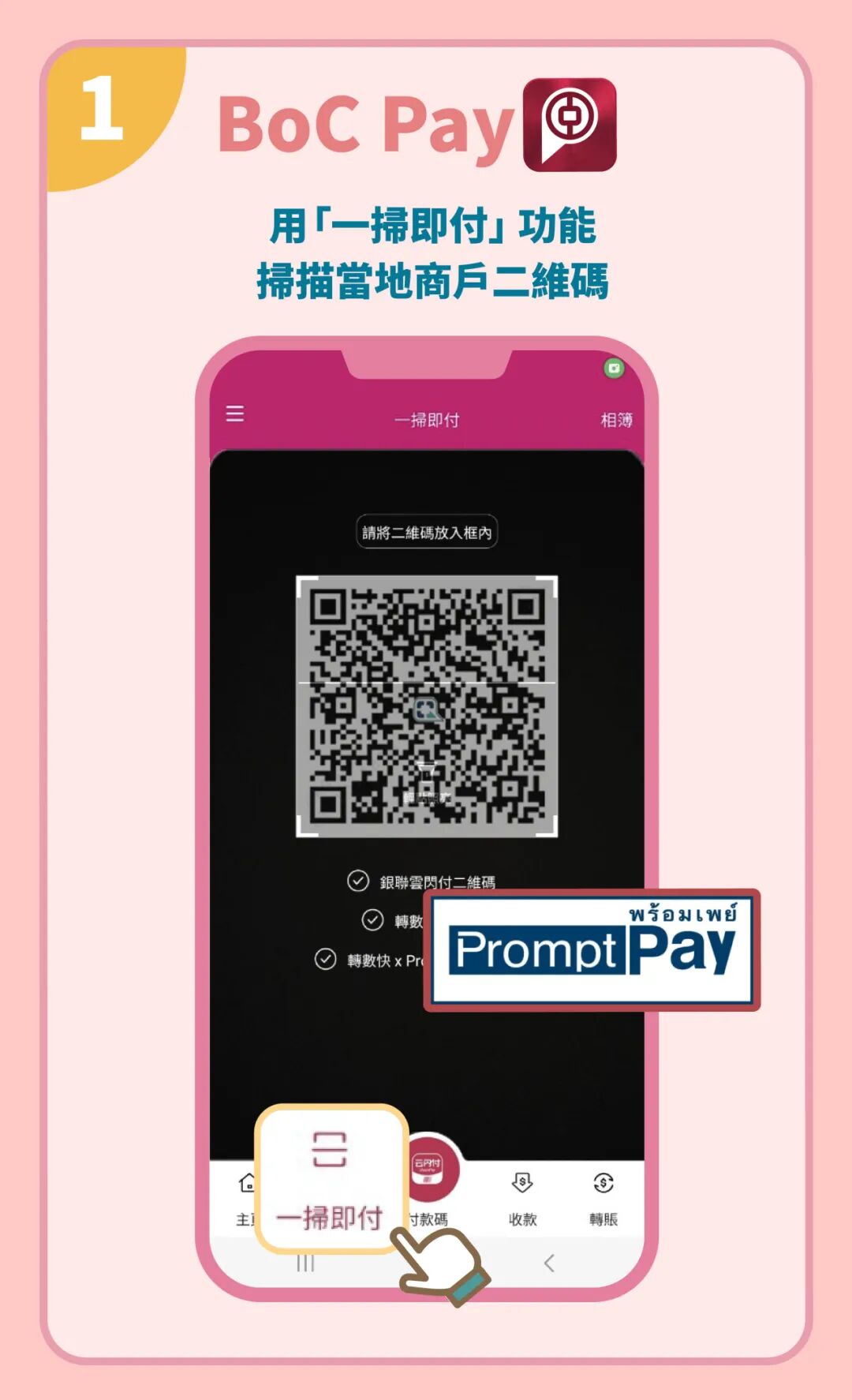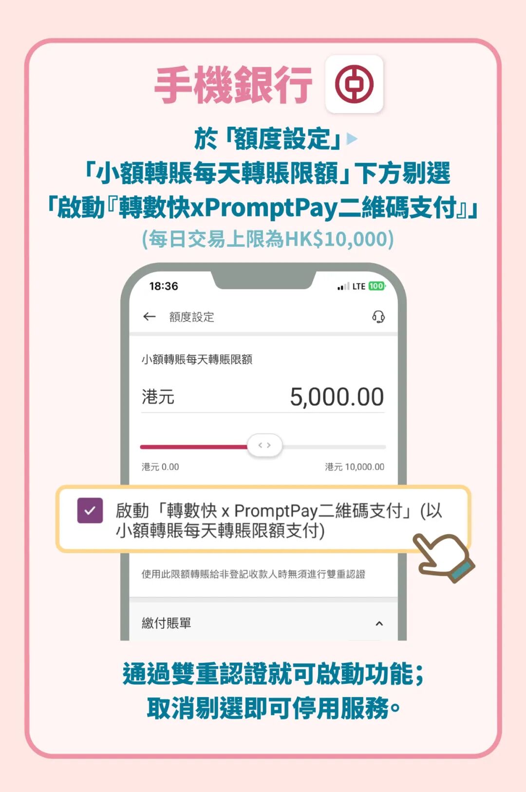 1不限金額,「轉數快 x PromptPay二維碼支付」最低及最高交易金額為等值港元0.01及港元10,000;向同一個泰國商戶重複付款只計算 1 次