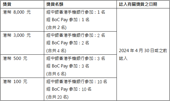 6.抽獎結果將在2024年4月30日或之前在中銀香港網頁 www.bochk.com、最新版本的中銀香港手機銀行及BoC Pay公佈,並按中銀香港紀錄的客戶電話號碼發送得獎通知短訊予獲獎客戶。