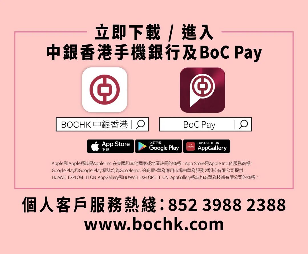 1.上述產品、服務與優惠受有關條款及細則約束,詳情請參閱相關宣傳品或向中銀香港分行職員查詢。