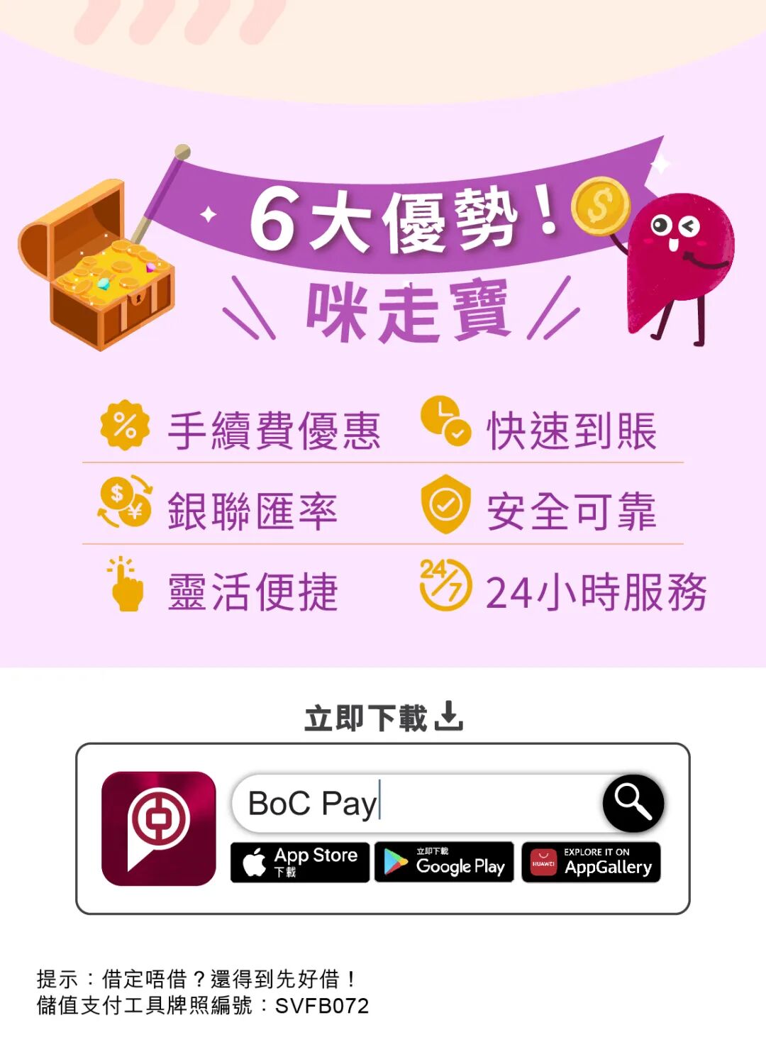 15.BoC Pay 建議操作系統版本:iOS(14.0或以上)及 Android(8.1或以上)。iPhone和iOS是AppleInc.在美國和其他國家或地區註冊的商標。AppStore是AppleInc.的服務商標。GooglePlay和Android是GoogleLLC的註冊商標。華為應用市場由華為服務(香港)有限公司提供。