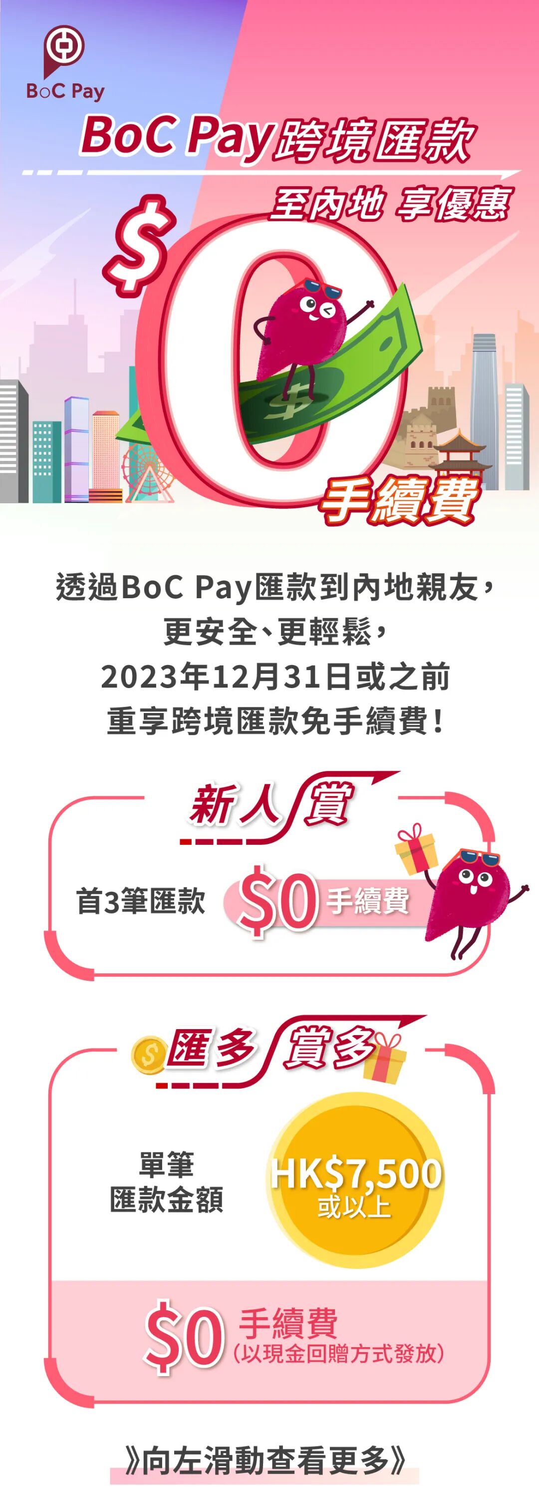 4.就2023年5月1日至2023年11月7日期間(包括首尾兩日)未曾以BoC Pay完成跨境匯款之合資格客戶,若於推廣期内透過BoC Pay進行跨境匯款交易,其首三筆的交易金額各自達到HK$2,000或以上的,亦可獲得全數手續費回贈。